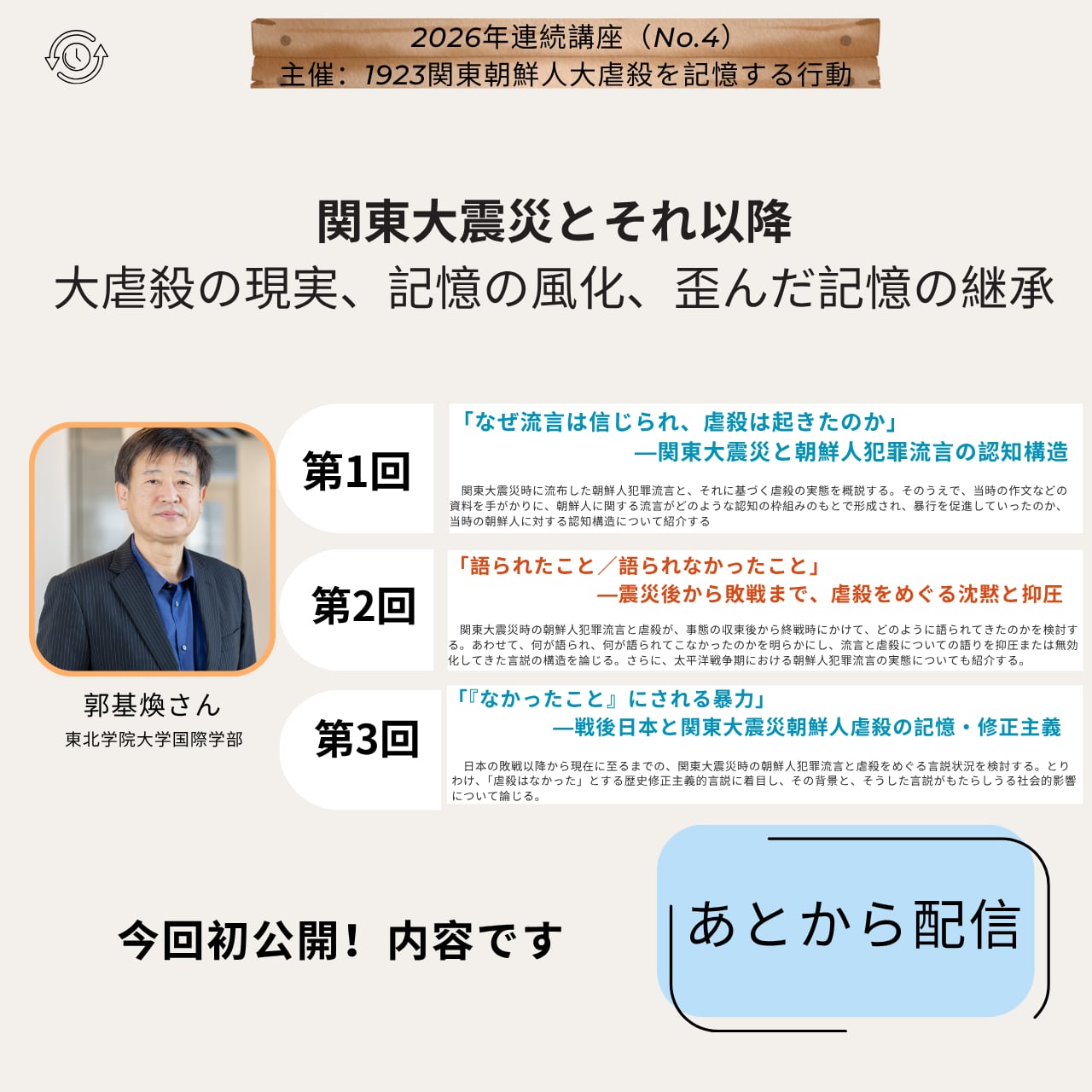 連続講座「関東大震災とそれ以降ー大虐殺の現実、記憶の風化、歪んだ記憶の継承」 講師 郭基煥さん(東北学院大学国際学部教授)